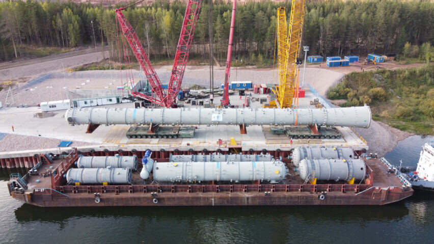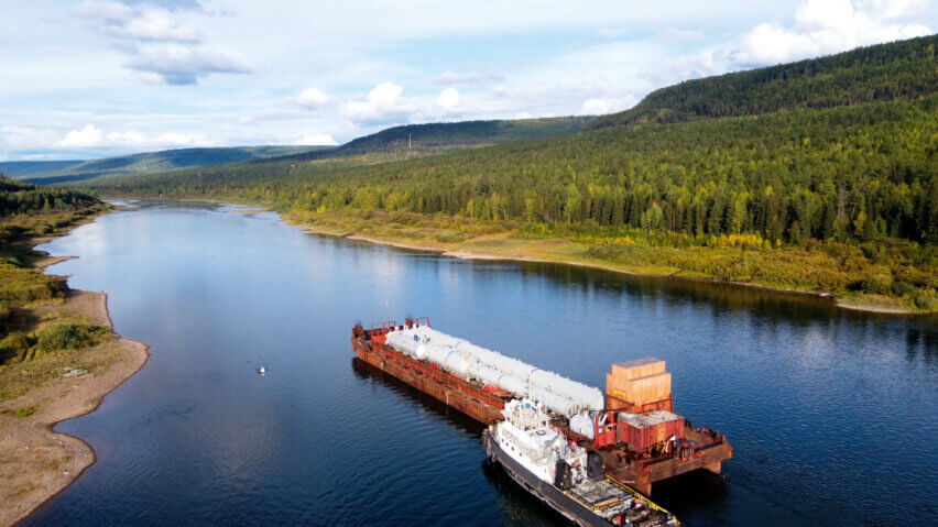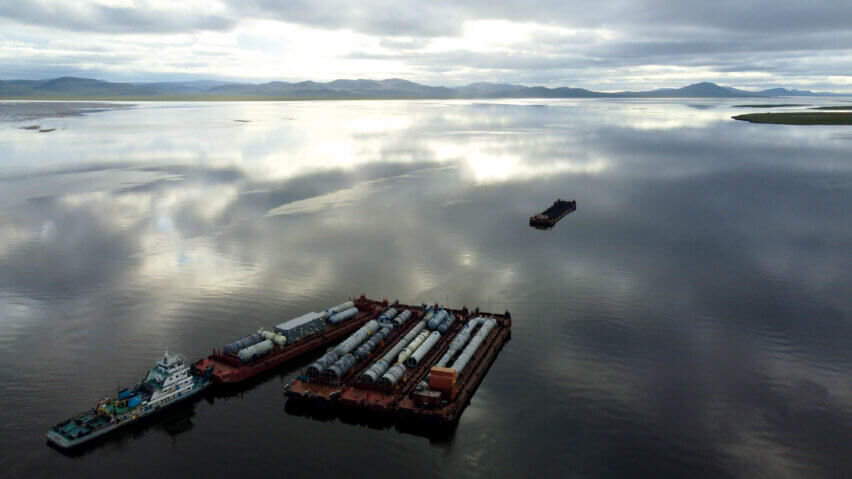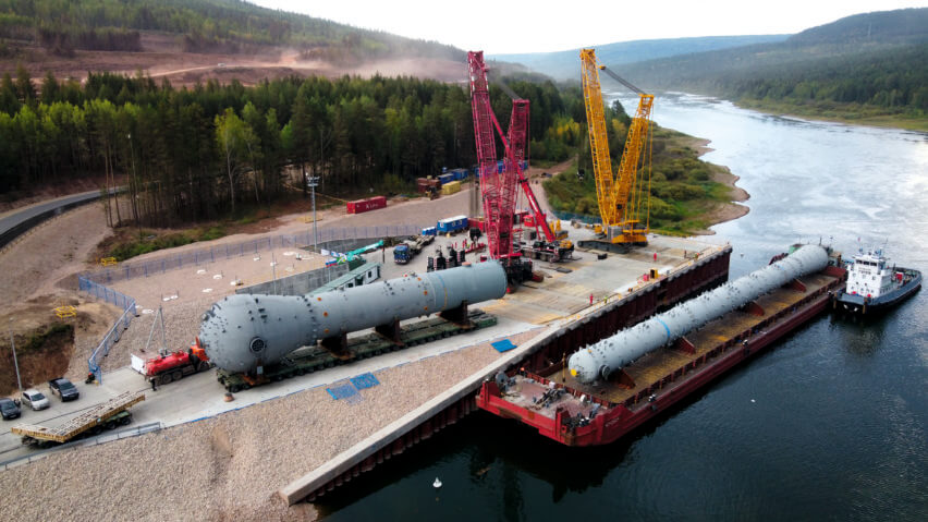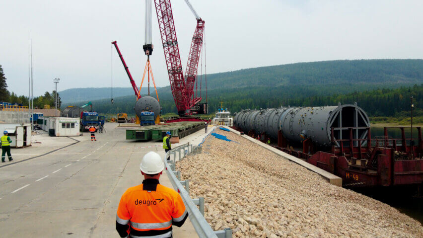 The first joint study with the client took place in 2016, whereby deugro prepared a survey and supported the project owner in determining the right location for the construction of the jetty on the Lena River. In close cooperation with the client, several road surveys were conducted to transport the 45 OSHL pieces—including a 597-metric-ton reactor with dimensions of 44.5 x 11 x 10 meters, and an ethylene fractionator weighing 357 metric tons with dimensions of 81.93 x 8.1 x 6.9 meters—from the Port of Tiksi via the Lena River to the project site in Ust-Kut.