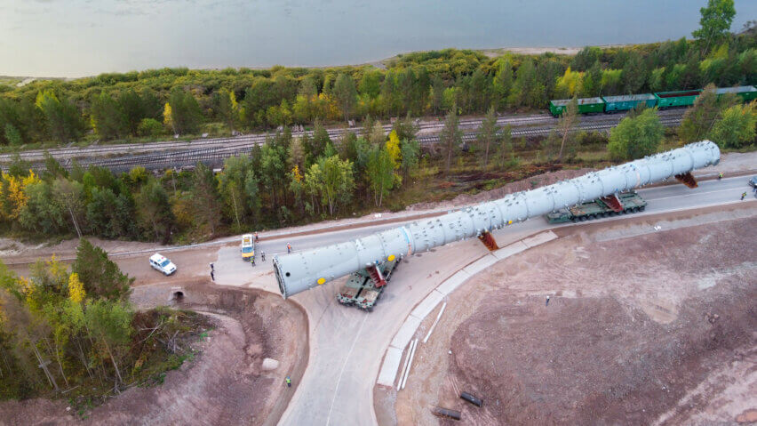 Due to the extraordinary dimensions and weights of the fractionator and the reactor, basic parameters such as the turning radius of the axial lines on curves, the height of upper constructions, the longitudinal slope of the road or the axle loading weight had to be considered to ensure smooth road transportation.