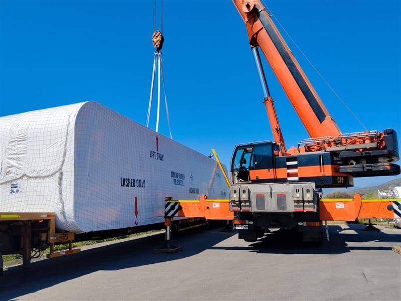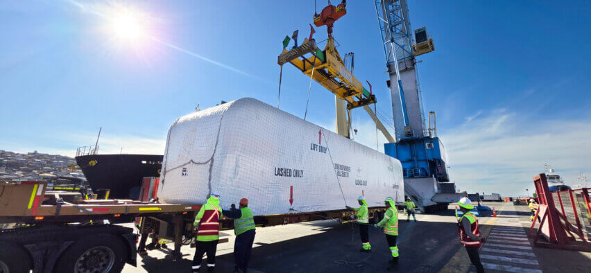 After a 7,000-nautical-mile ocean voyage, the vessel arrived at the Port of Valparaíso, Chile, where the over 18-meter-long, 30-metric-ton unit was directly discharged by port crane onto a special extendable low bed trailer, which was arranged for by deugro Chile.
