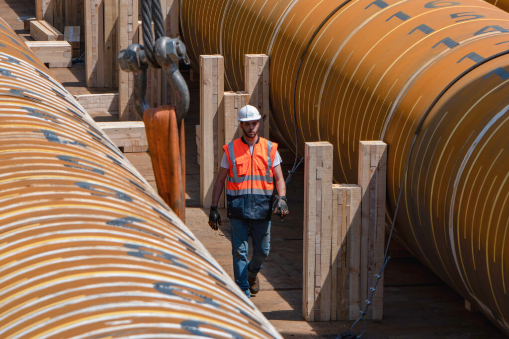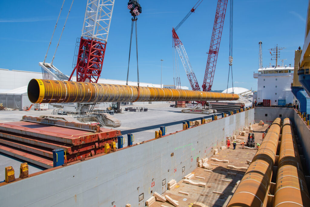 deugro, in collaboration with dteq Transport Engineering Solutions (dteq), successfully delivered eight pin piles from Bilbao, Spain to Vlissingen, Netherlands as part of the Baltic Eagle offshore wind farm project. The 77-meter-long pin piles, with a weight of over 270 metric tons each and a diameter of 2.4 meters, are the largest piles ever manufactured by Haizea Bilbao.